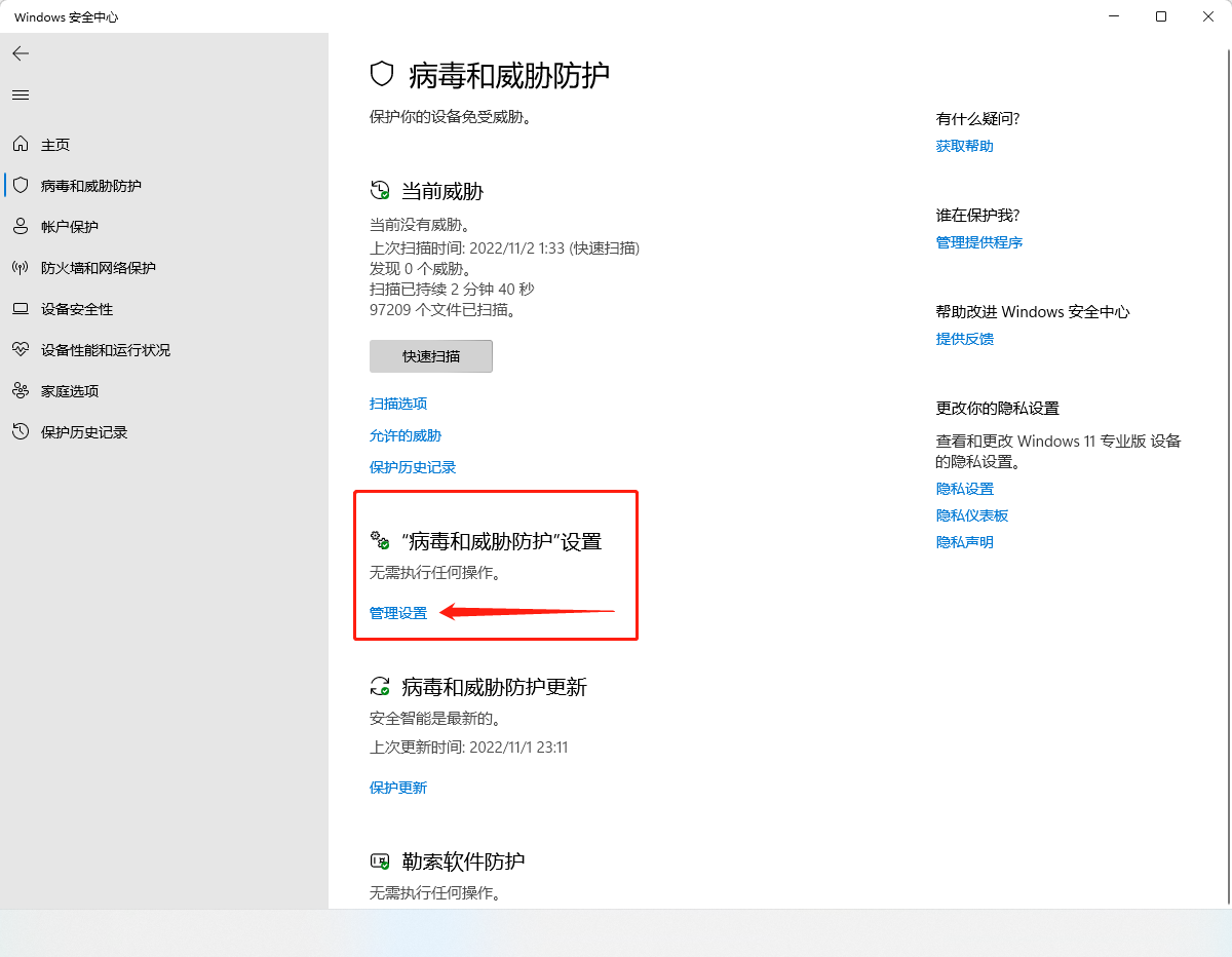 点击windows按钮,输入设置-> 打开设置 -> 隐私和安全 -> windows 安全中心 -> 病毒和安全防护 -> (病毒和安全防护设置) 管理设置 -> 关闭实时保护